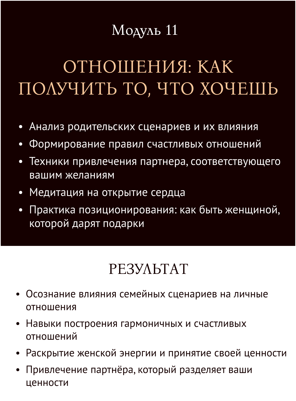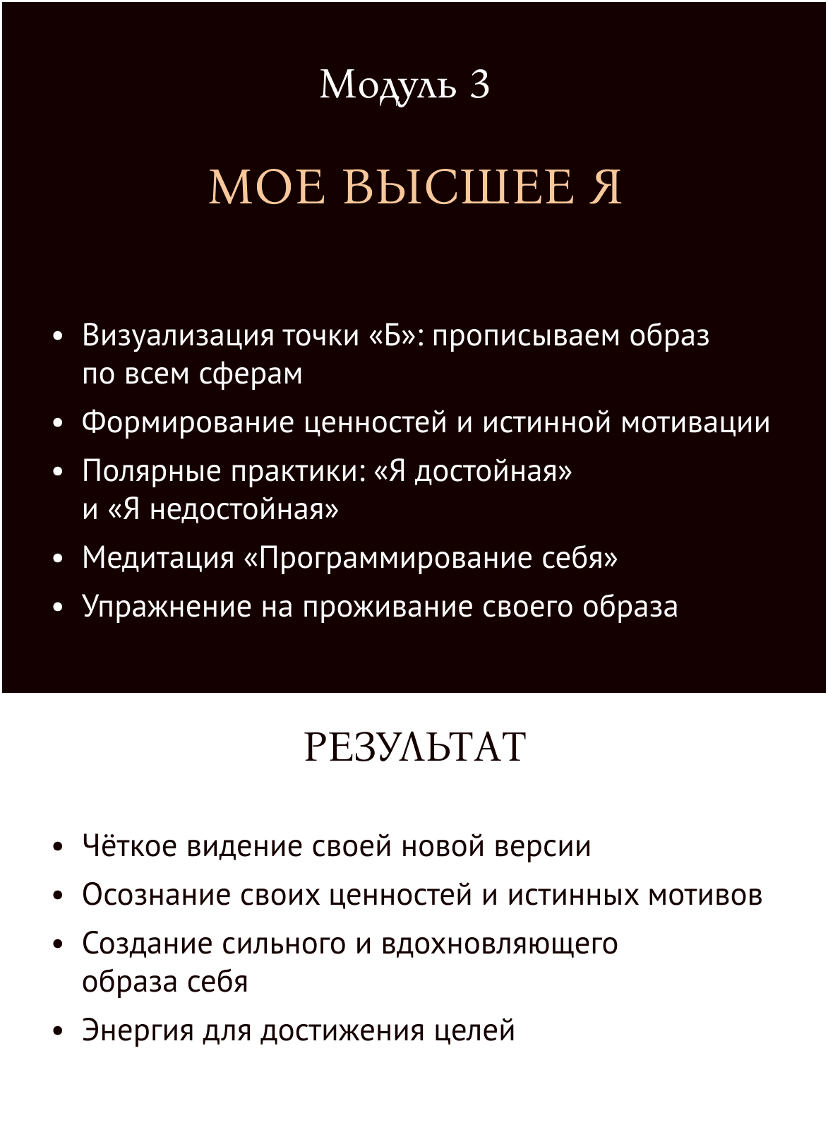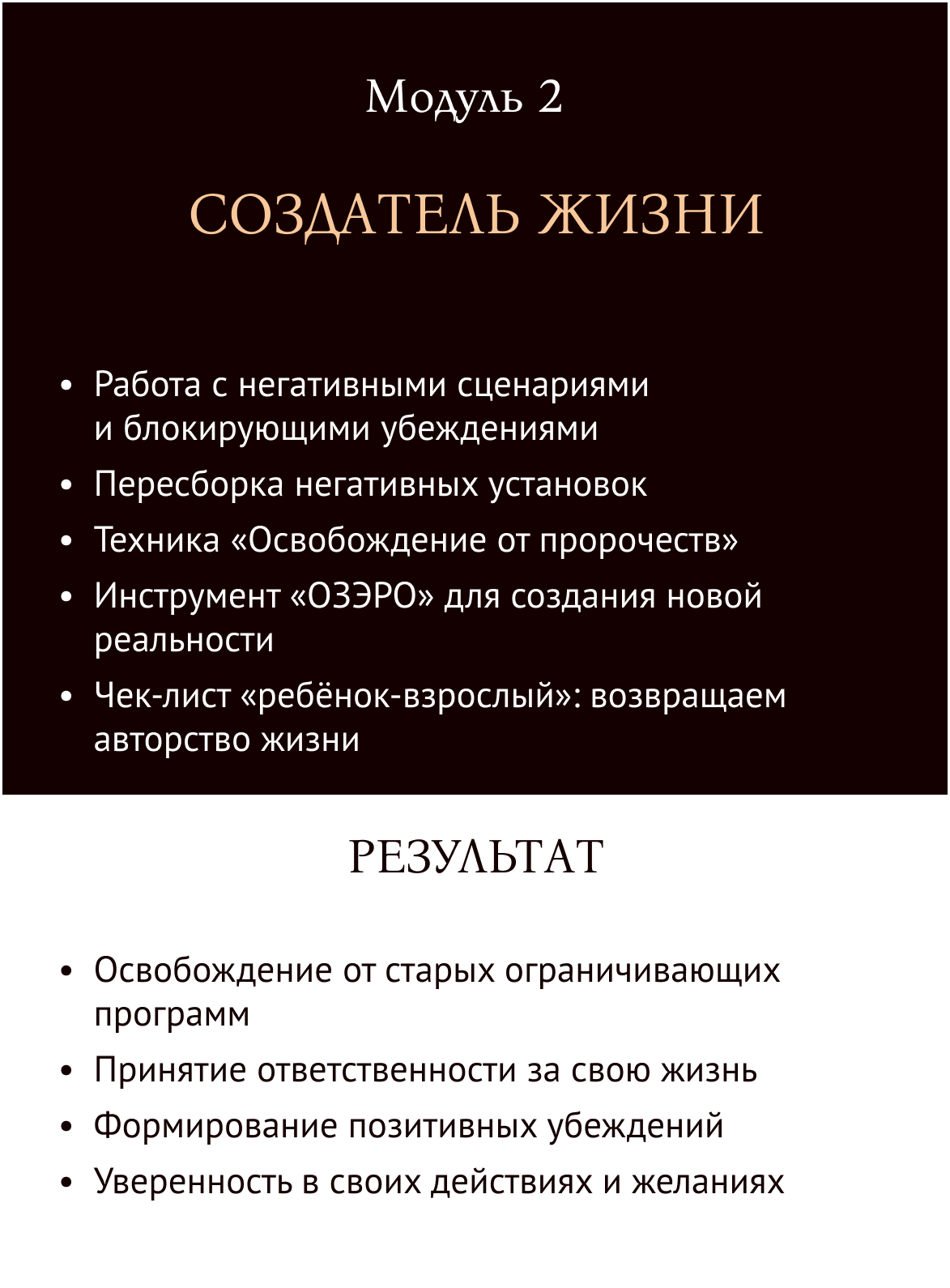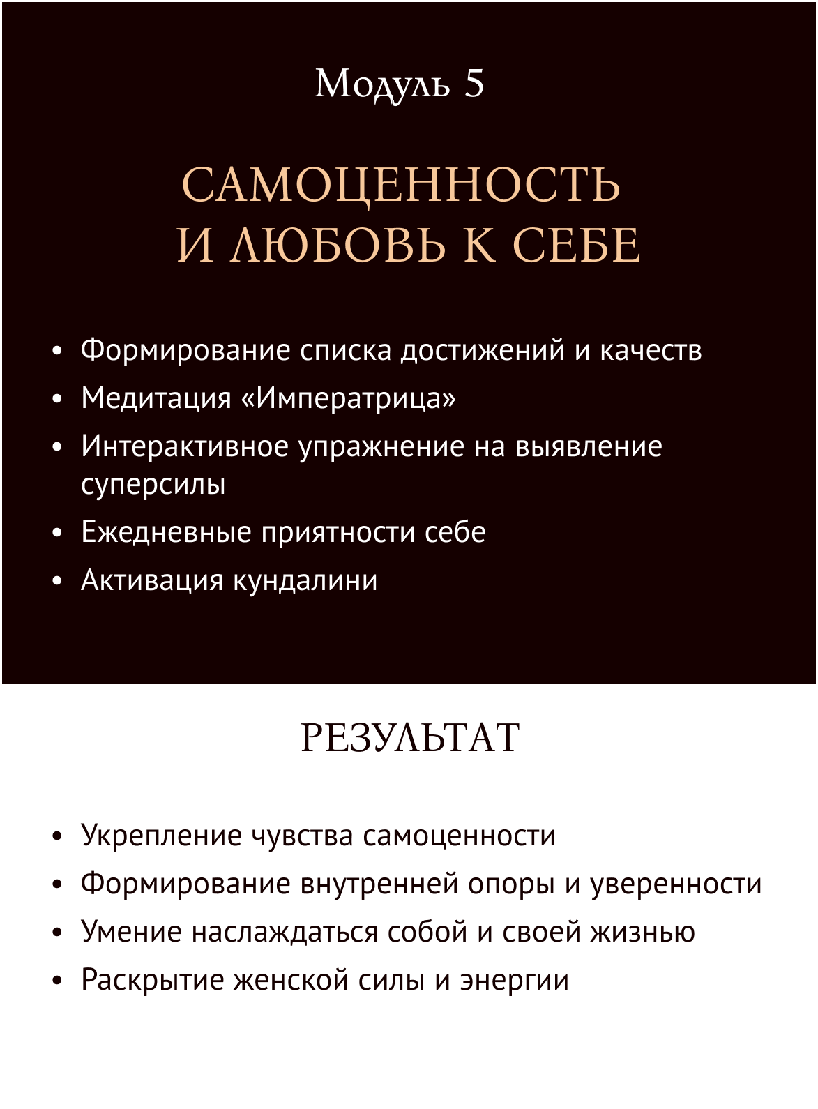 Программа направлена на полное перерождение: проработку ограничивающих установок, раскрытие женской энергии, достижение целей и создание нового образа жизни. Вы научитесь работать с телом, разумом и душой для достижения гармонии.