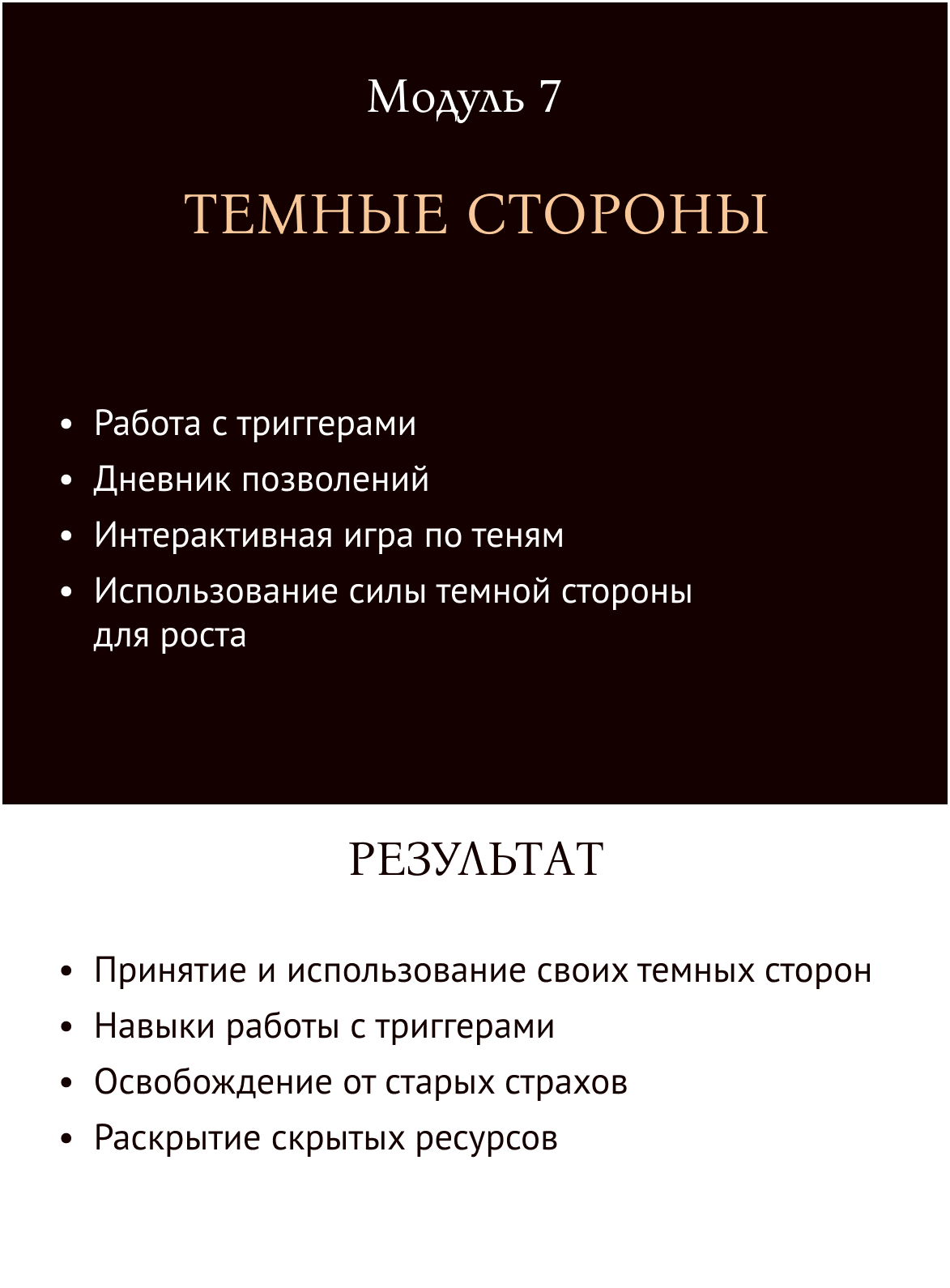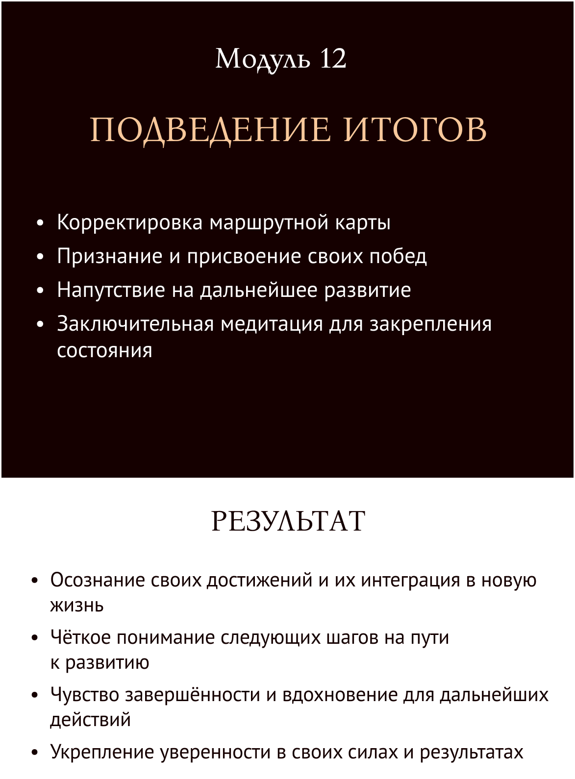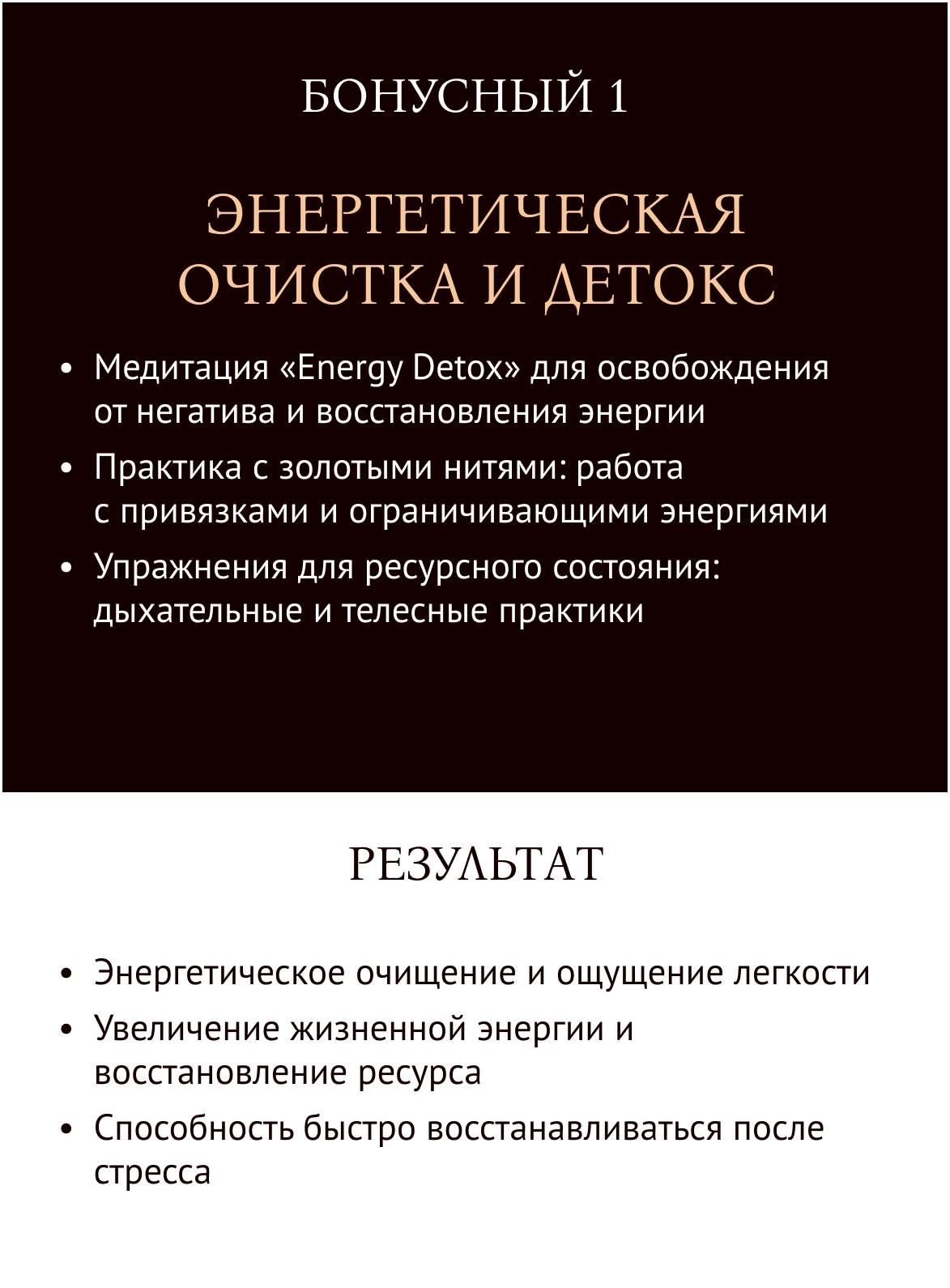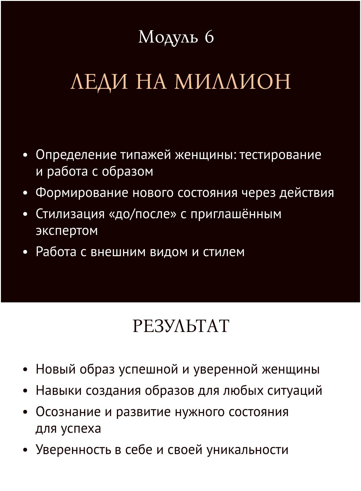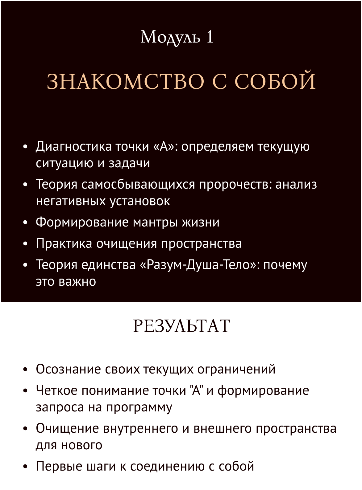 Программа направлена на полное перерождение: проработку ограничивающих установок, раскрытие женской энергии, достижение целей и создание нового образа жизни. Вы научитесь работать с телом, разумом и душой для достижения гармонии.